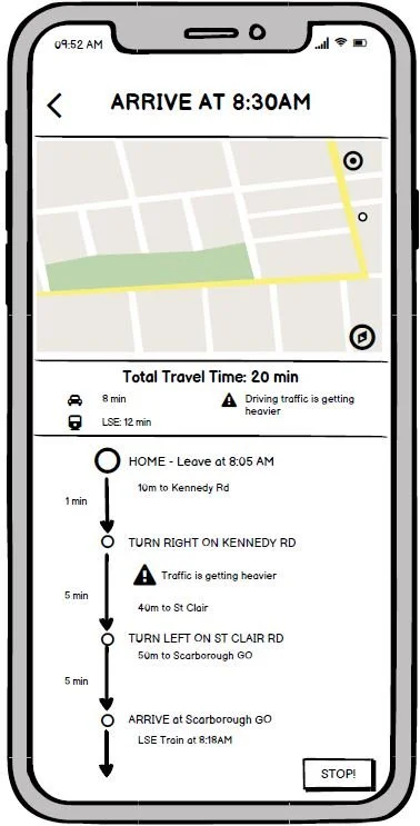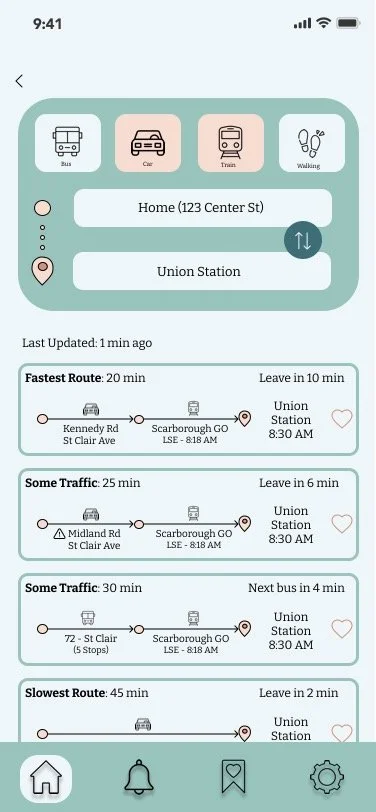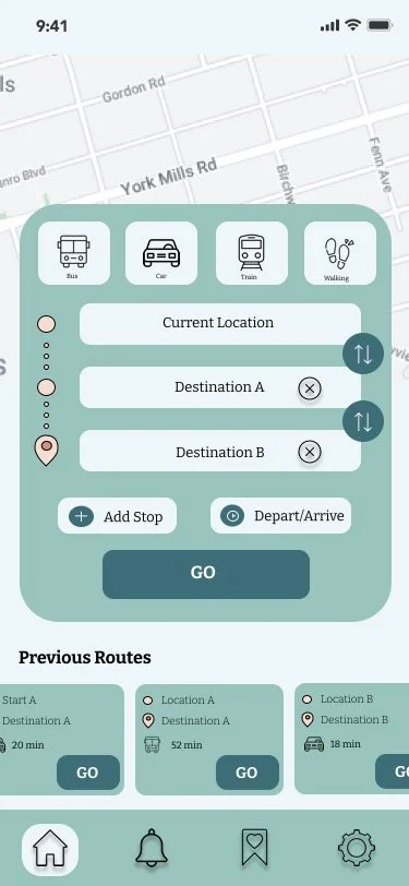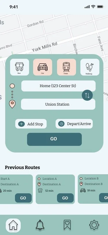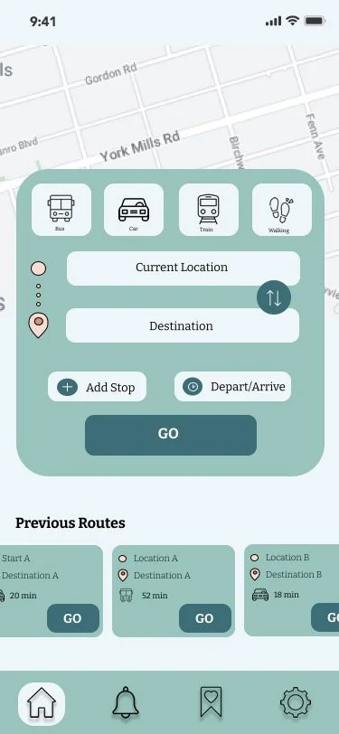 For this case study, I wanted to explore creating a trip planner mobile app that would be designed to help transit riders plan the most efficient route to their destination. It was designed to help make the planning process stress-free and easy by incorporating real-time notifications about public transit delays and traffic.