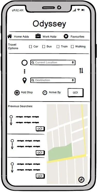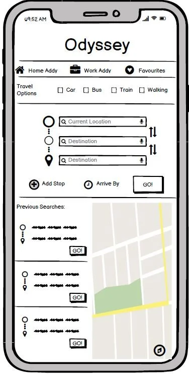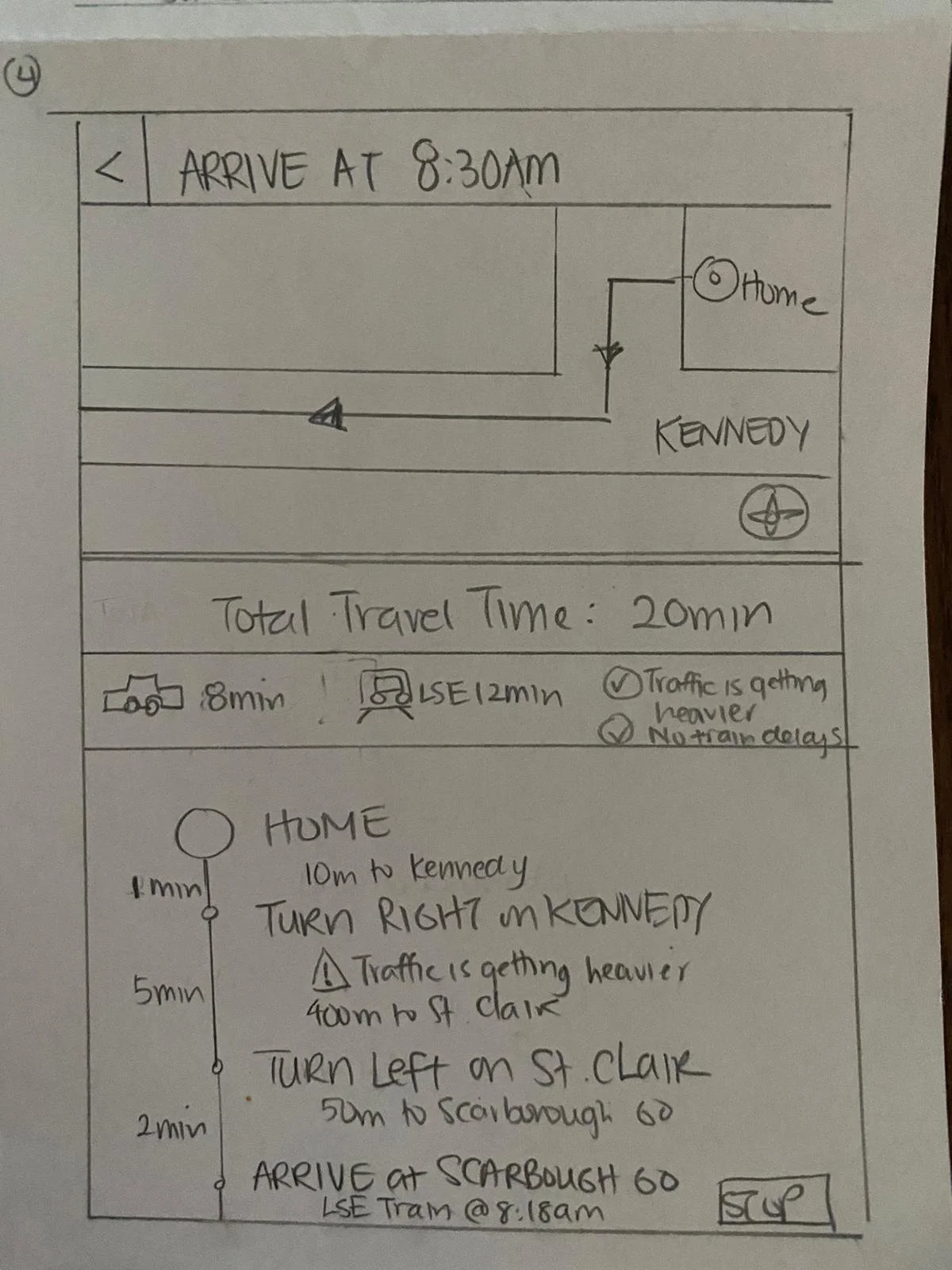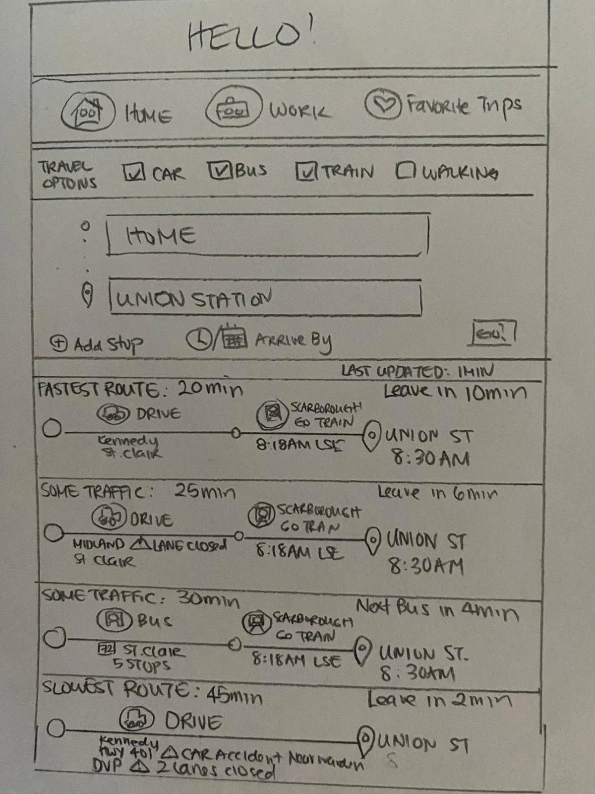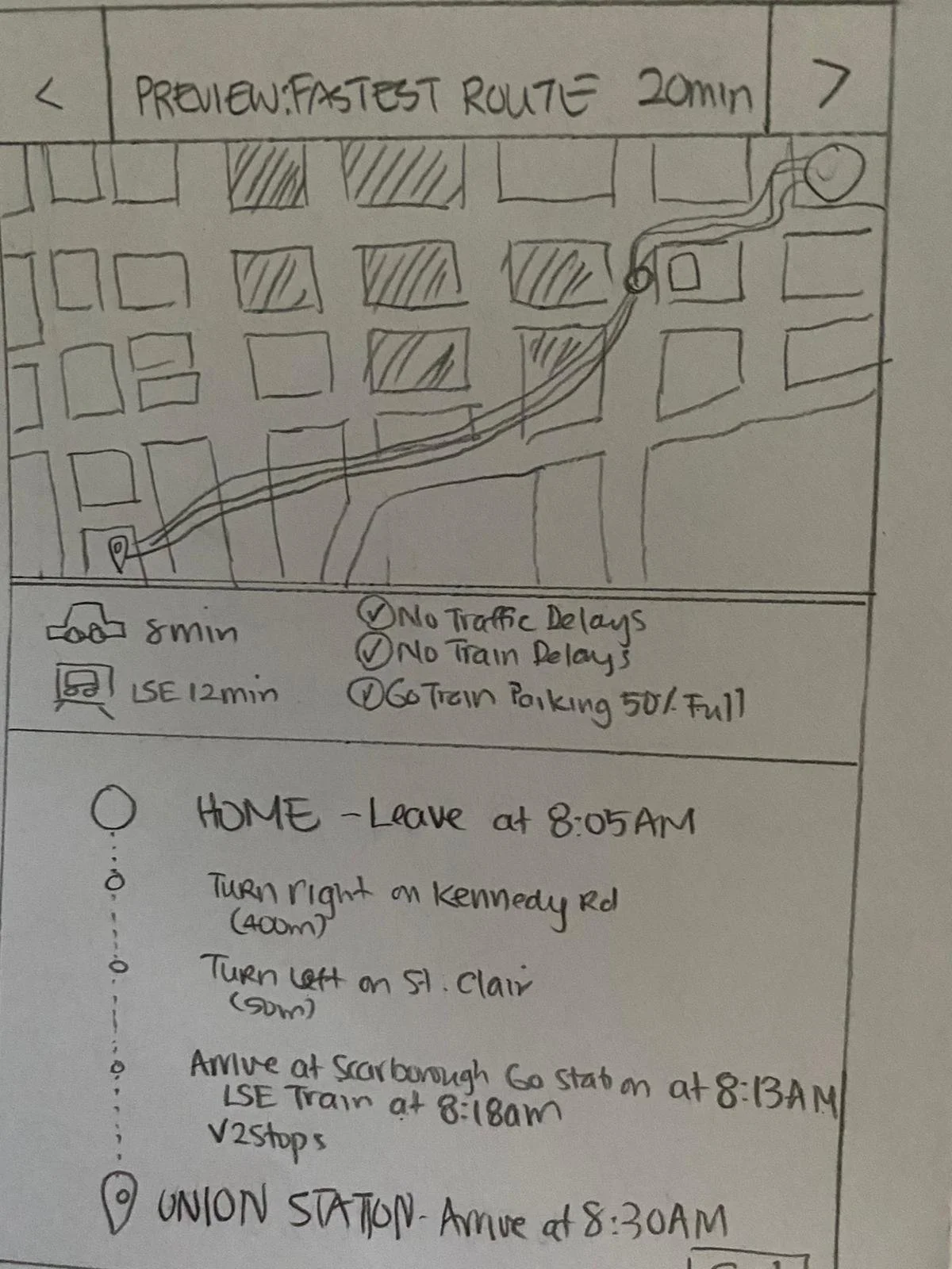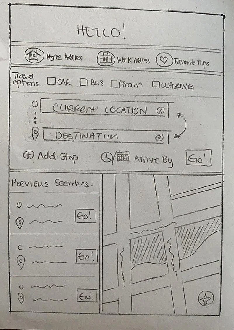 Based on the research, I had put together some sketches that captured the ideas from the customer journey. The user should be able to enter the parameters (destination, travel options, etc) of their query, select the route that best fits their requirements and then start their trip. Using the low fidelity sketches, I created a simple user flow and had users perform some testing.