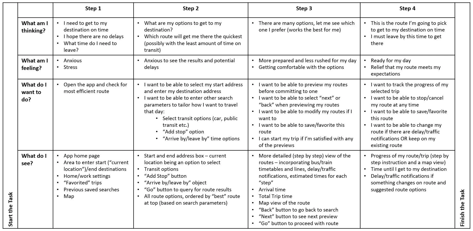 A customer journey map was created to further illustrate the commuter’s goals, thoughts, and pain points.